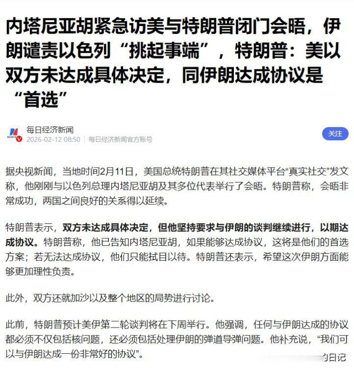 会谈结束后,特朗普仅在“真实社交”上发文,称双方未达成明确决定,唯一共识是“坚持与伊朗谈判”。