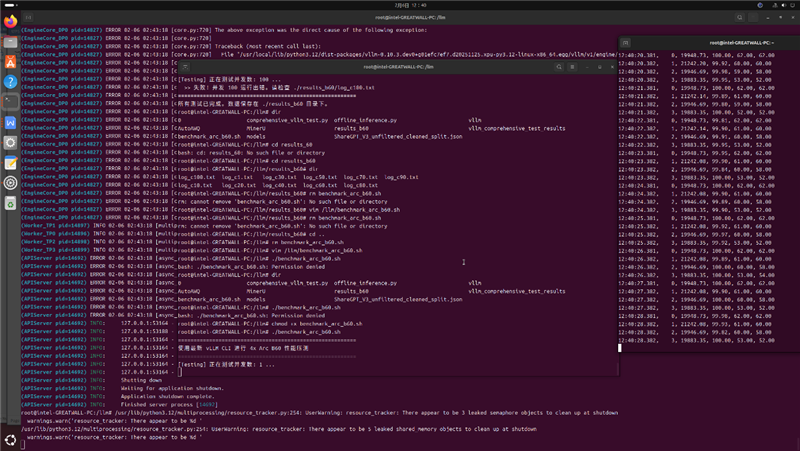 vLLM版本是最新的0.5.0,无法使用过去的benchmark_serving.py脚本进行测试,因此我们直接使用vllm bench serve命令,分别测试并发数1,10,20,30,40,50,60,70,80,90,100时的AI性能。