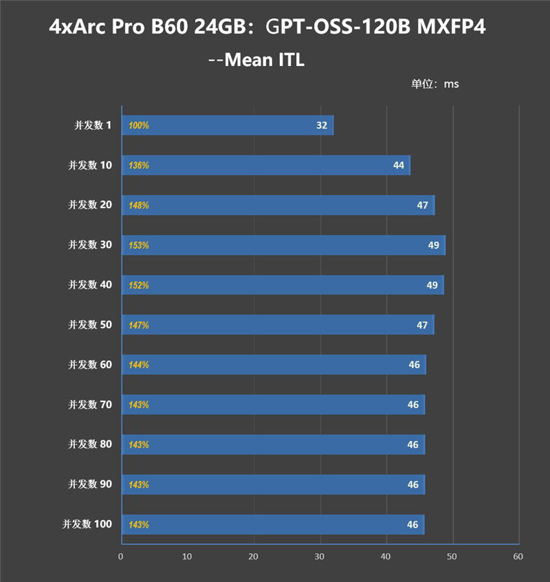 4张Arc Pro B60 24GB在低并发数时性能优势并不明显,但随着并发数的提升,特别是达到100并发后,4张Arc Pro B60 24GB的性能几乎是单卡的4倍。