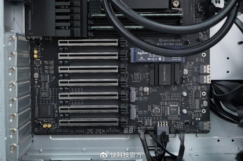 超大的水冷头与水泵采用了分离设计,水泵在其中一根水冷管上。