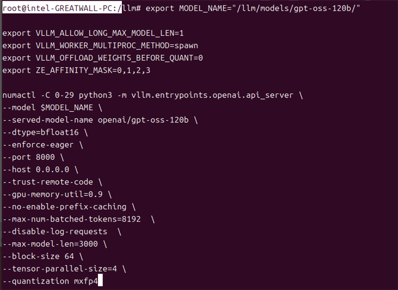 我们将GPT-OSS-120B模型下载至容器的llm\models目录下,并开启vLLM OpenAI API服务,具体参数如下:
