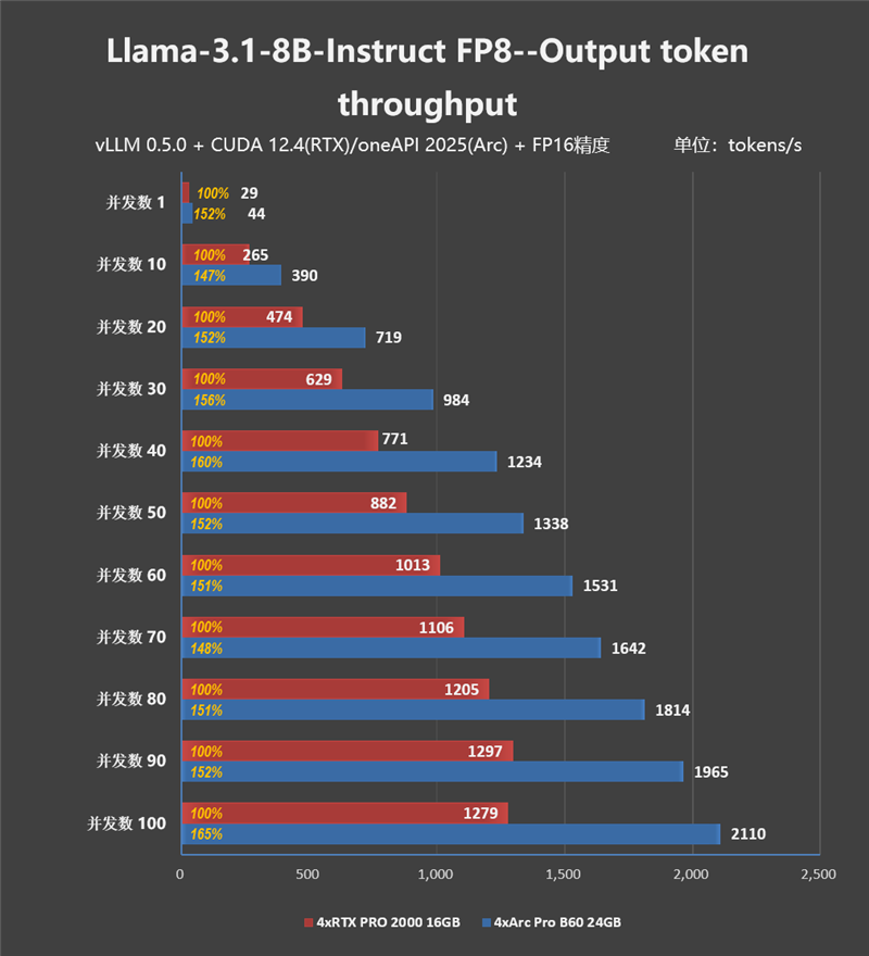 同样是4卡并行运算(Llama-3.1-8B-Instruct FP8),4xArc Pro B60 24GB比起4xRTX Pro 2000 16GB要强了50%左右,在并发数为100的情况下,凭借96GB大显存,高负载(Batch 100)下,Intel 方案达到了 2110 Tokens/s,而同样价位的NVIDIA方案仅为 1279 Tokens/s。