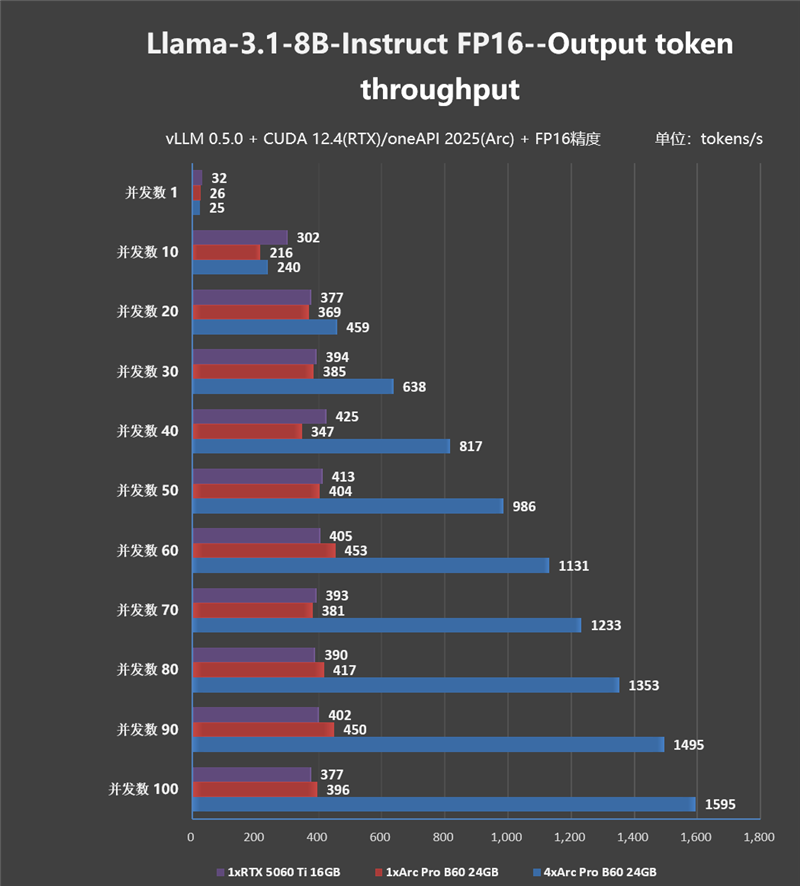 Llama-3.1-8B的显存需求只有7GB左右,因此不仅可以对Arc Pro B60 24GB进行单卡、双卡、4卡测试,我们还能测试桌面版RTX 5060 Ti 16GB的推理性能并与之进行对比!